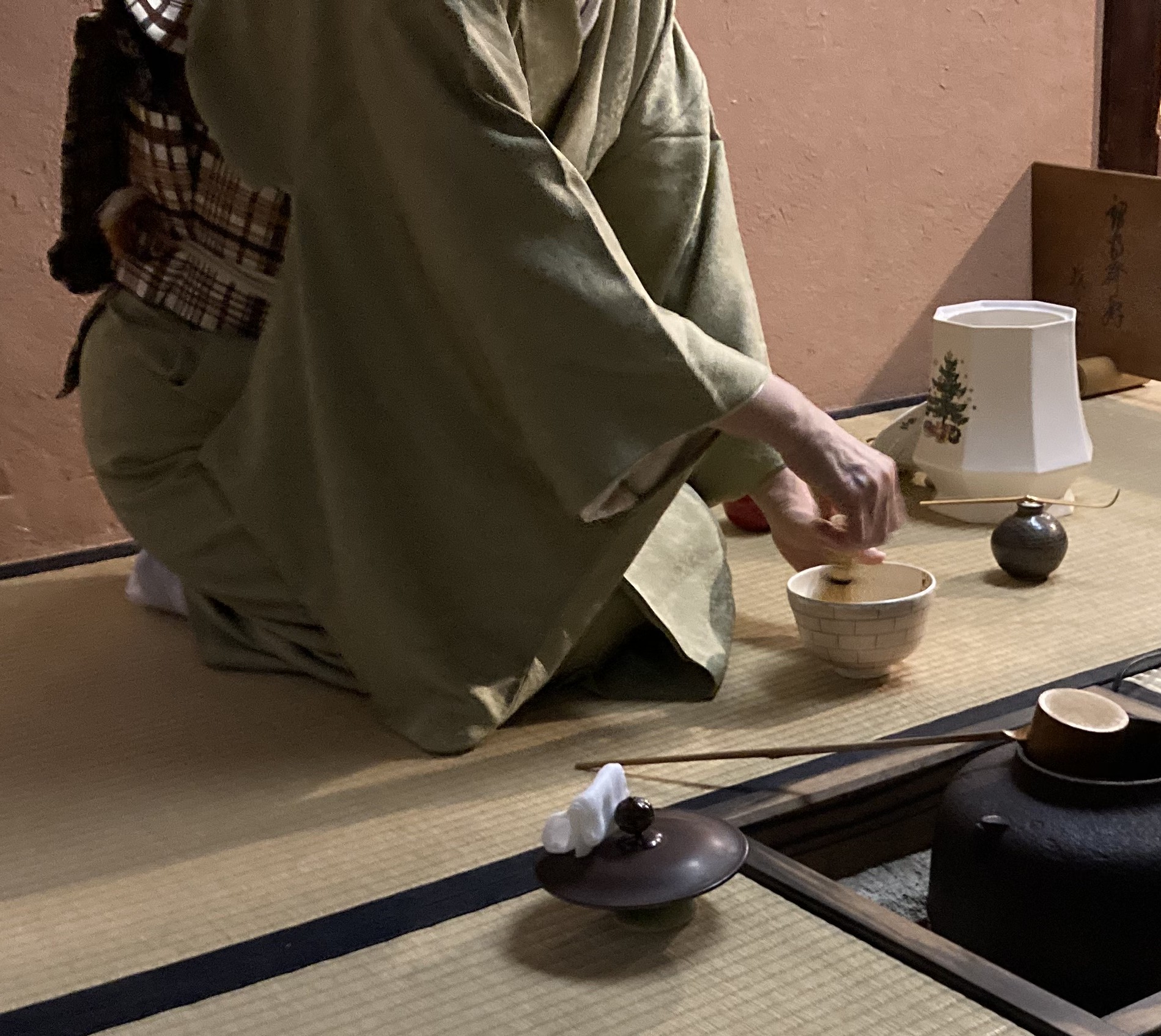 • Using the tea scoop (chashaku), the host carefully transfers matcha from the tea container (natsume) into the tea bowl.