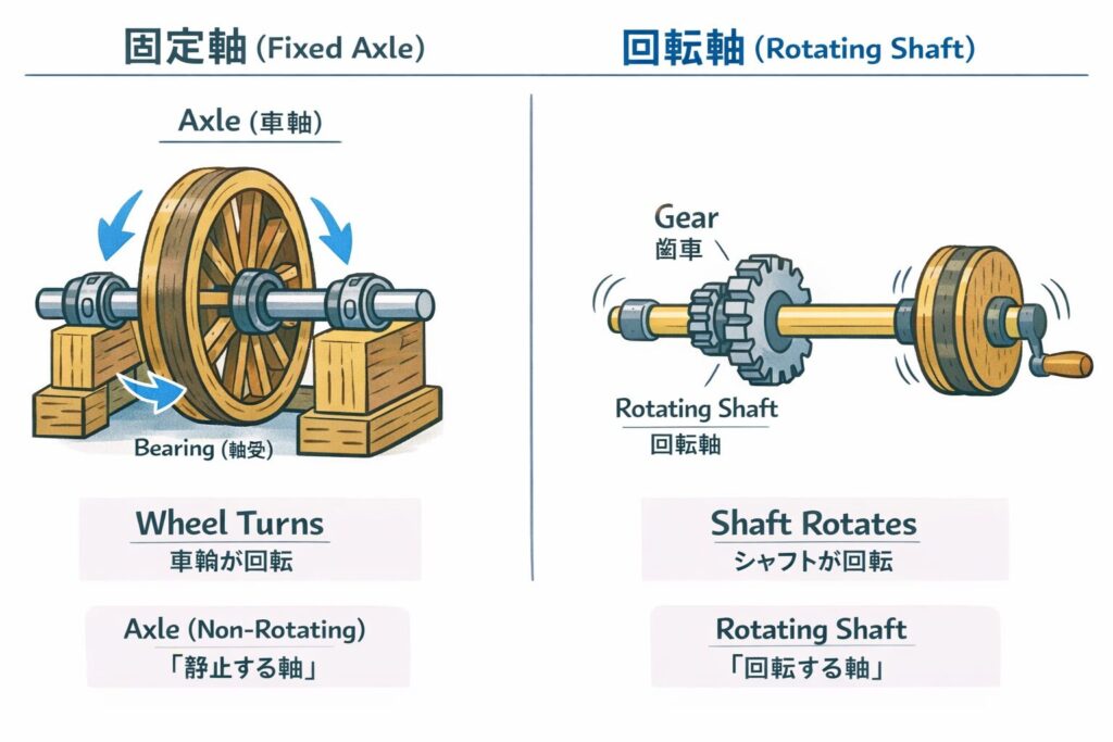 - 👆Axle = 回転体を支える軸(回転する場合としない場合がある)