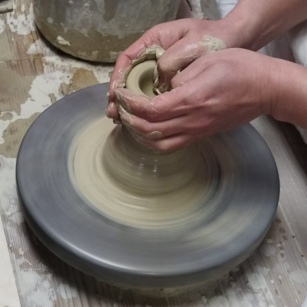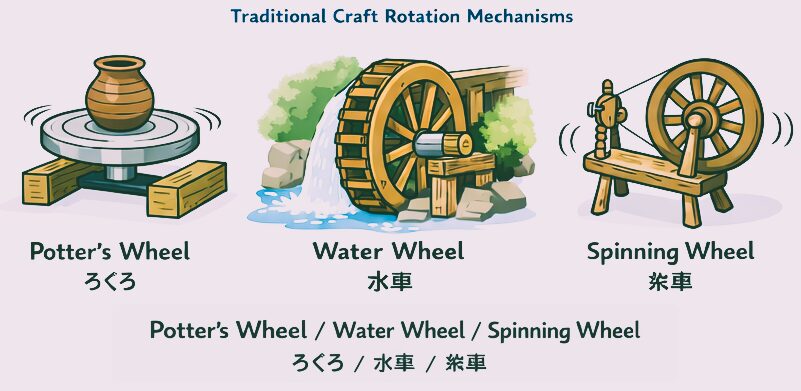 👇ガイドのコツ: 陶芸の「ろくろ」は Potter’s wheel、水車は Water wheel 、糸車はSpinning wheelと呼びます