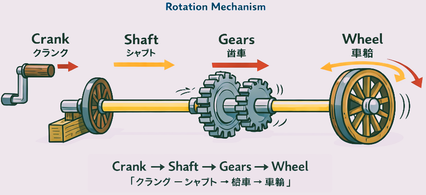 👉回転機構は、(A)回転体そのもの、(B)動力を伝える軸や歯車、(C)手で動かす操作部の3つで構成されます。