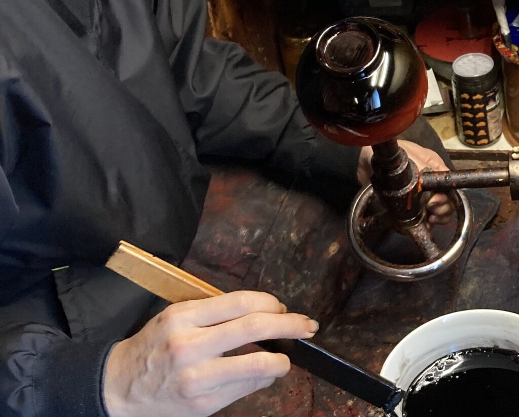 - a. 工芸品の回転台の説明 “The artisan places the lacquerware on this rotating disc to apply even coats of lacquer.” (職人はこの回転円盤の上に漆器を置き、漆を均一に塗り重ねていきます。)