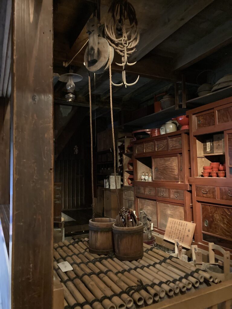 - a. 水車の動力伝達軸 “The rotation of the wheel is carried through this long wooden shaft to drive the machinery inside.” (水車の回転は、この長い木製の回転軸を通って内部の機械を動かします。)