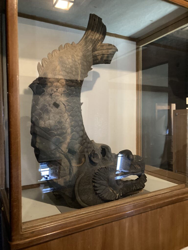 5. このシャチホコは、直近の修理で取り外され、間近でじっくり見学できるのは貴重な機会です。日本の歴史的天守閣の殆どは、武士の争いと落雷、近代の空襲による火災で失われました。