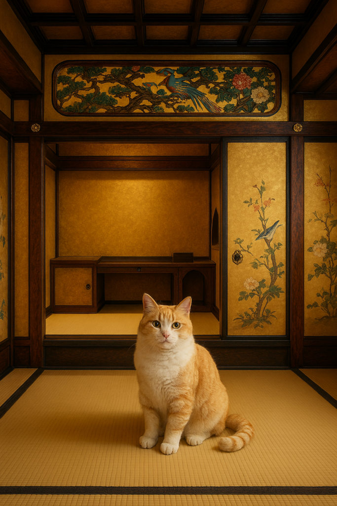 - 部屋の木は色漆で塗られ、壁は金砂子(きんすなご)で覆われています。