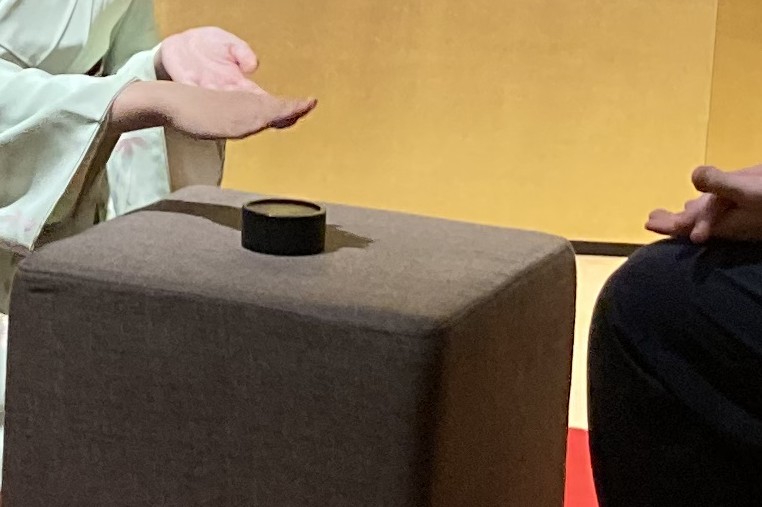 2. A cushion is placed between the geisha and the guest with a bowl on top.