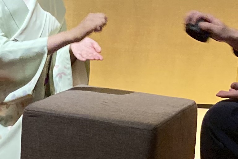 4. クッションが芸者とお客さまの間に置かれ、その上にお椀を載せます。唄のリズムに合わせて、交互に、お椀を取るか、お椀を触るんです、手を開いてね。